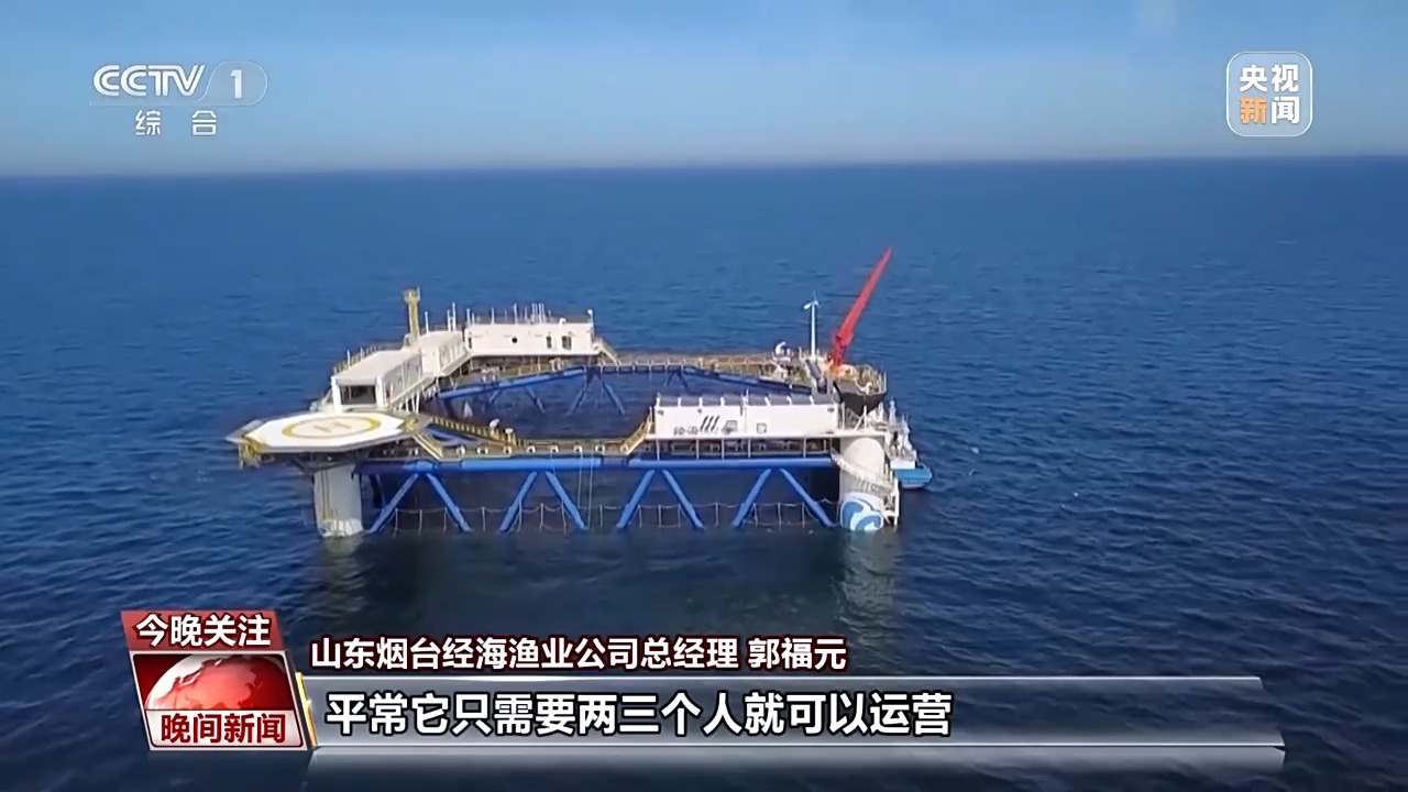 山东烟台经海渔业公司总经理 郭福元:深水网箱可以承受百年一遇的浪高是8.6米,最大海水流速是每秒1.6米。平常只需要两三个人就可以运营,智能化和信息化手段都在这个网箱上有所体现。
