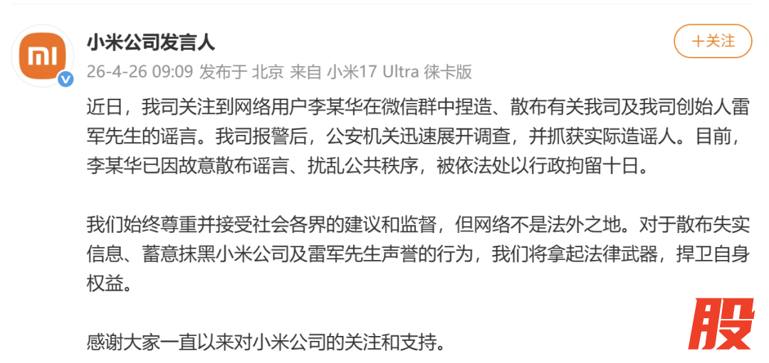 近日,我司关注到网络用户李某华在微信群中捏造、散布有关我司及我司创始人雷军先生的谣言。我司报警后,公安机关迅速展开调查,并抓获实际造谣人。目前,李某华已因故意散布谣言、扰乱公共秩序,被依法处以行政拘留十日。